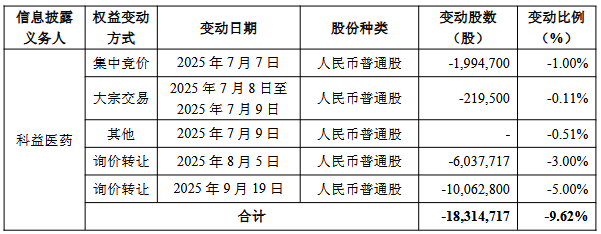 9月22日,中国经济网络北京,Syovac Pharmaceuticals(688136.SH)最近透露了一份有关股东调查转移结果的报告,并迅速宣布了有关股东股票变化的变化,这些变化具有5%以上的股东的资本变化,并且“简化股份变化的报告”。据宣布,深圳Keyi Pharmaceutical Holdings,Ltd。(以下名称为“ Keyi Pharmaceutical”)通过研究转移于2025年8月5日通过研究转移降低了其6,037,717个诉讼,占其总社交资本的3.00%。 2025年9月19日,我们的参与通过参考转移减少了10,062,800次行动,该参考转移占我们Capisuch社会社会的5.00%。此外,2025年7月7日,凯里药品减少了1,994,700 AC通过密集的优惠。从2025年7月8日到2025年7月9日,Keyi Pharmaceutical通过批量贸易减少了他在219,500次行动中的持股。总共减少了2,214,200股。药品keyi及其共同演员Deng Xueqin的总参与度从65.00%下降到55.38%,累积参与的变化达到了整个5%的倍数。 Keyi Pharmaceutical减少了对公司股票的参与,总计18,314,717股。缩短期间股票的平均价格为46.60元,现金总额约为853,465,812.2元。行动改变后,Keyi Pharmaceutical拥有109,688,630股公司,占公司总股本的54.50%。 Deng Xueqin直接拥有1,764,125股,占公司总资本的0.88%。 Keyi Pharmaceutical及其共同演员Deng Xueqin总共拥有111,452,755股,该公司涵盖该公司总股本的55.38%。它占据了它。这次被问到的转移Fang Keyi Pharmaceutical是由皇家总统兼总裁Deng Xueqin管理的公司。 Keyi Pharmaceutical和Deng Xueqin处于联合行动关系。这种转移不会对我们的实际管理股东和控制者造成任何变化,也不会显着影响我们持续的治理和运营结构。
